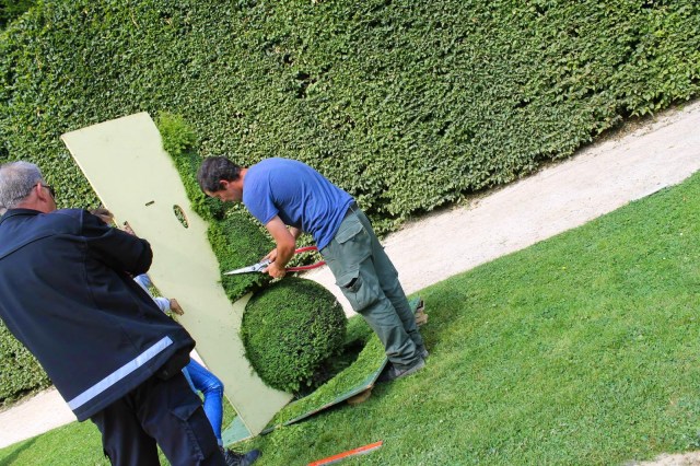 Caretaker trimming the bushes by hand